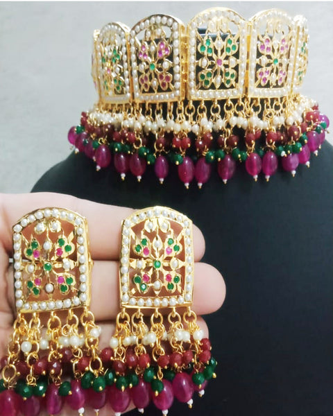 Beautiful One gram gold plated Jadau jwellery Dark Pink Color Necklace, Earrings for Special Occasion