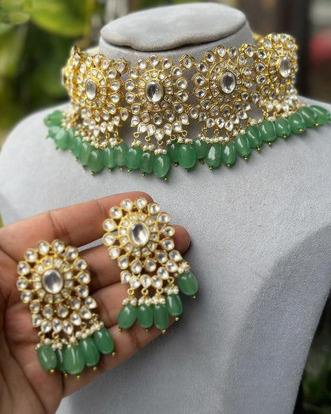 Beautiful One gram gold plated Jadau jwellery Green Color Necklace, Earrings for Special Occasion