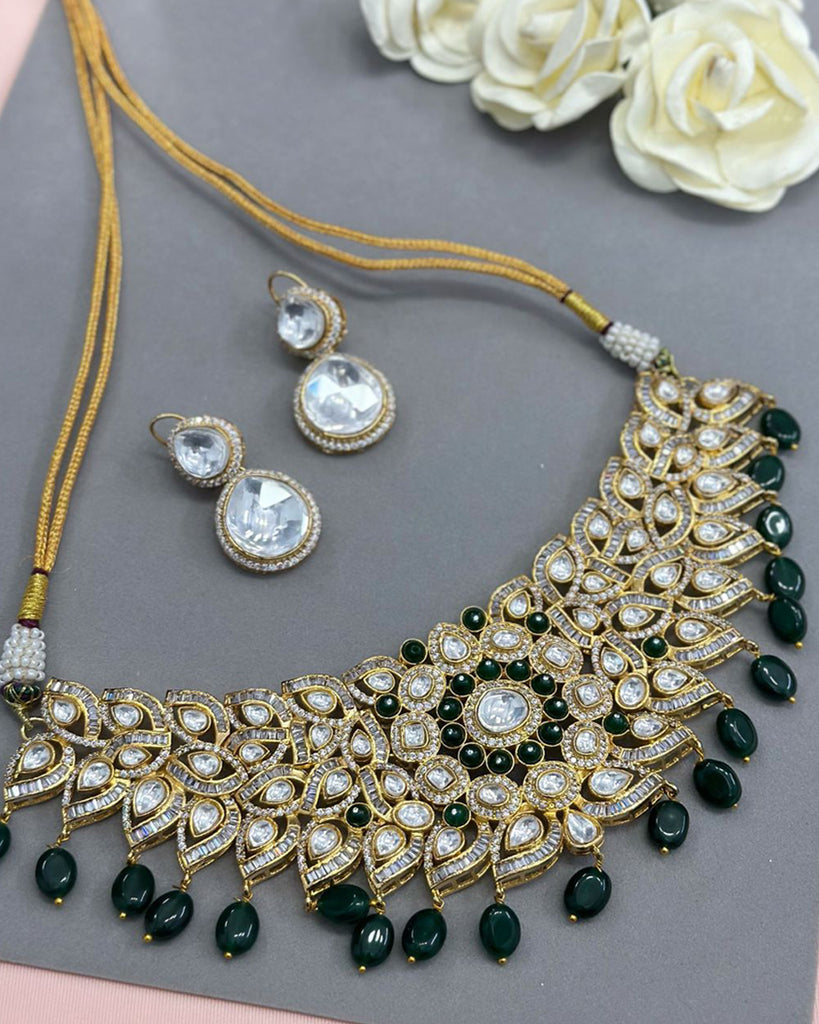 Golden & Dark Green Color Kundan Jadau Necklace with Earrings
