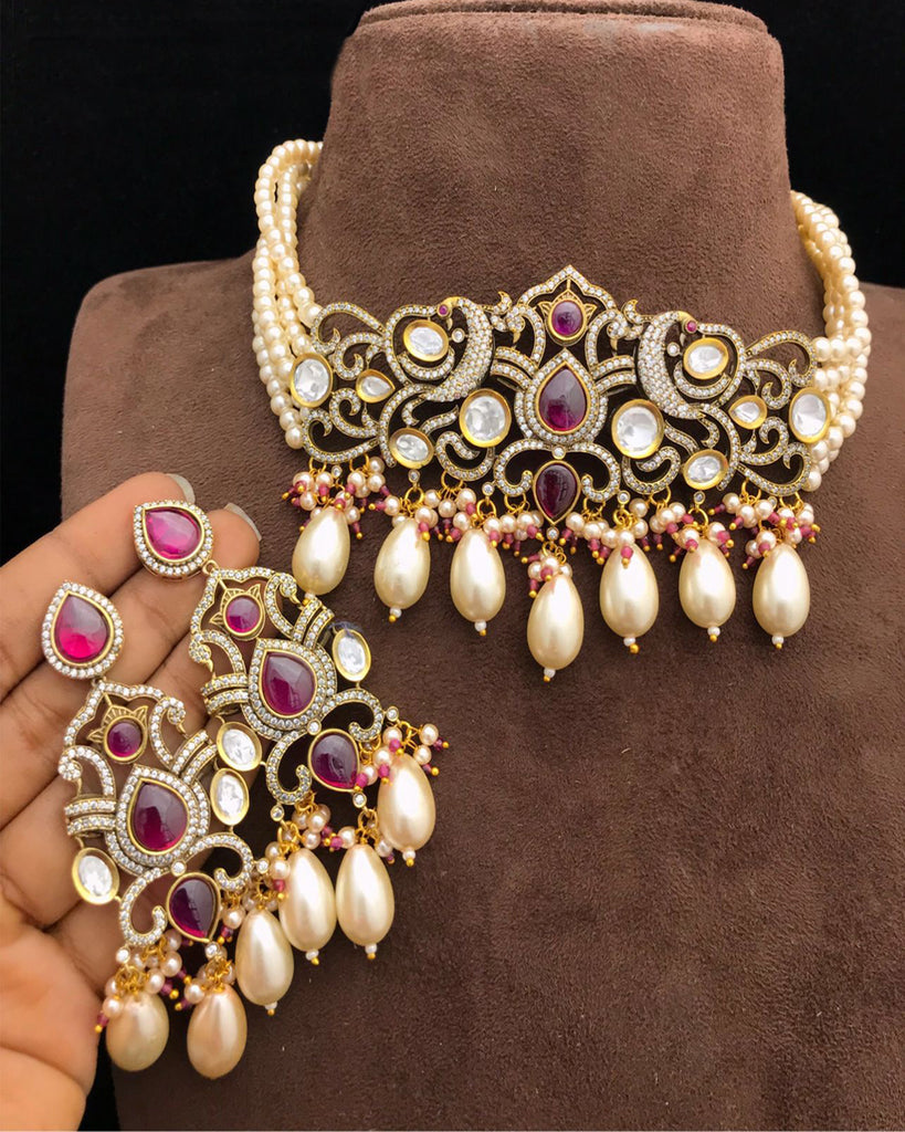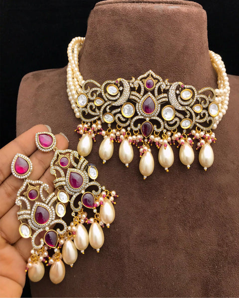 Party Wear Pink Jadau Kundan Necklace with Earrings